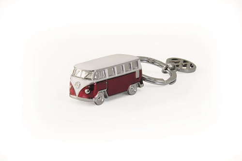 VW Bulli 3D-s fém kulcstartó, a kulcskarikán Volkswagen logós embléma.