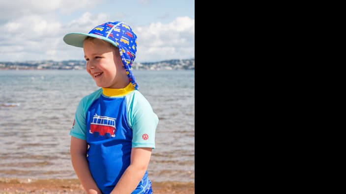 Bulli T1 és Käfer gyerek sapka rugalmas anyagból készült, nap- és nyakvédelemmel.