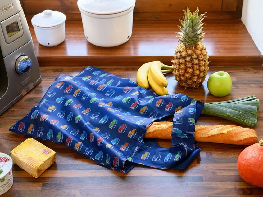 Hosszú fogantyús, összehajtható bevásárló táska többféle Bulli mintával. A táska kapacitása kb. 15 kg.