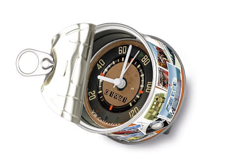 Konzerv formájú óra, melyet akár hűtőmágnesként, akár az íróasztalra helyezve is használhatunk. Átmérője 8,5 cm, magassága: 5 cm.