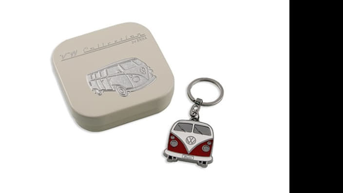 VW Bulli frontját mintázó fém kulcstartó díszdobozban.