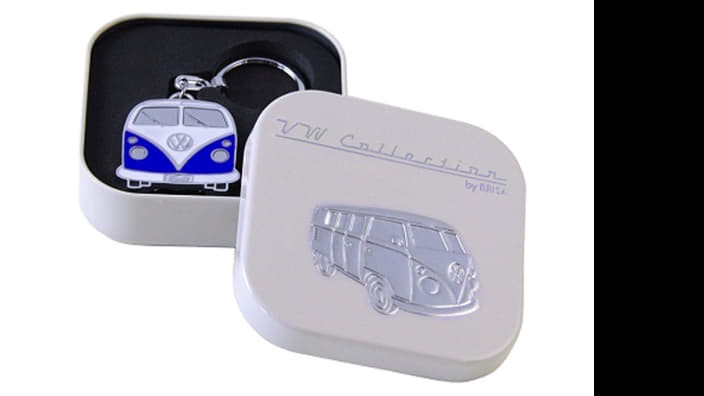 VW Bulli frontját mintázó fém kulcstartó díszdobozban.