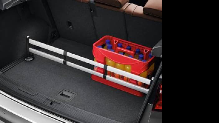A rakomány biztonságos rögzítése - A Volkswagen eredeti csomagtartóba való beépíthető moduljával rugalmasan eloszthatja a jármű csomagtartóját és a rakományt védheti a csúszástól. A csomagtartó modul szabadon elhelyezhető a rakodópadló külső szélei mentén szorítóbilincsekkel, és a csomagtartó moduljának teleszkópos rudja biztosítja a biztonságos tartást.