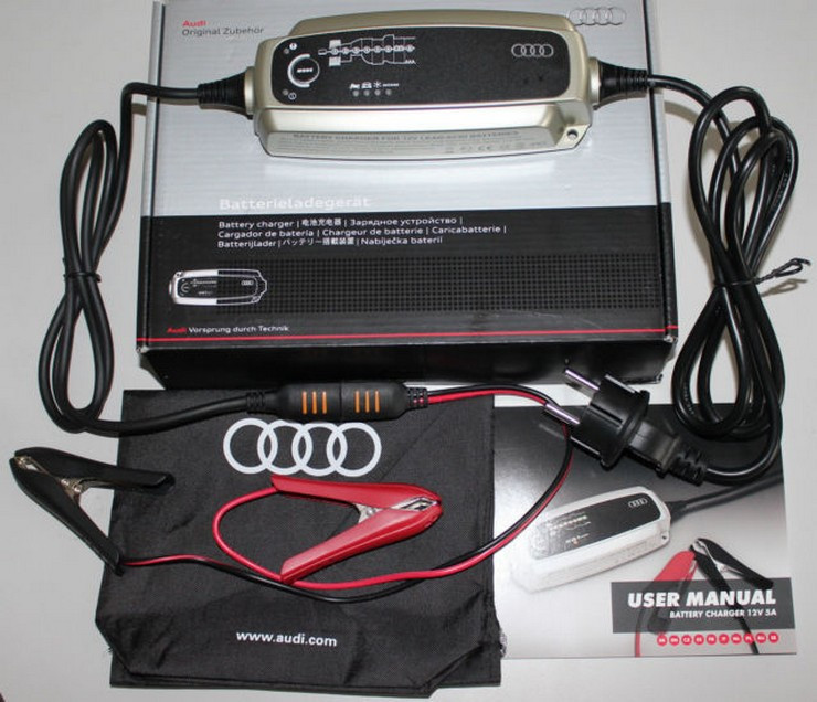 Az Audi Battery Charger 5.0 egy teljesen automatikus, 8 fokozatú töltő, választható töltőárammal (0,8 A és 5 A között) 12 V-os akkumulátorokhoz. A praktikus kijelző lehetővé teszi a teljes töltési folyamat nyomon követését.