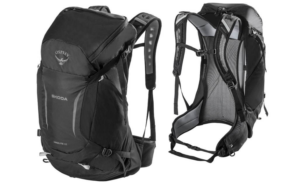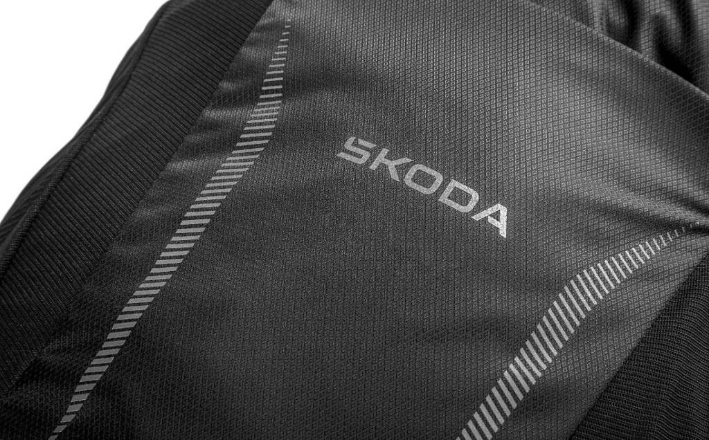 Fényvisszaverő Škoda és Osprey márkajelzés a hátizsák elején, minimalista Škoda és Osprey márkajelzés a vállpántokon, fényvisszaverő Škoda és Osprey márkajelzés az esőkabáton.