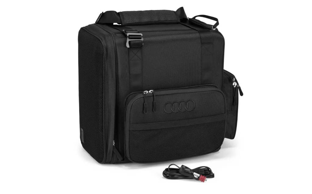 Termoelektromos hűtődoboz, hűtött italok vagy élelmiszerek szállításához hosszú utakon. A doboz akár 14 literes is lehet. Az áramellátást a jármű 12 voltos csatlakozója biztosítja. Az Audi Genuine hűtődoboz egyedi kialakításával és az elején hímzett Audi karikákkal tűnik ki.