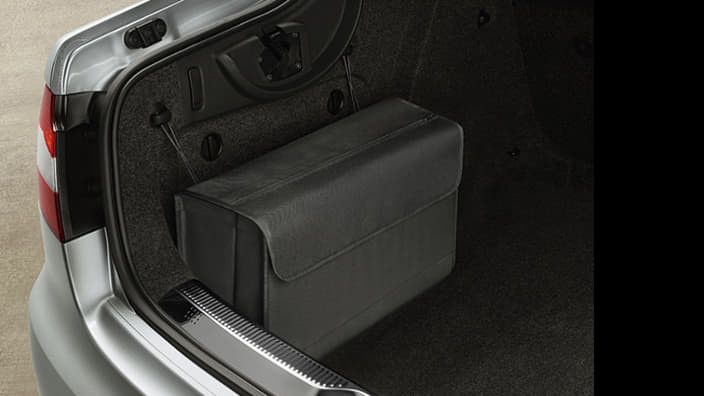 Skoda csomagtértáska a rögzítőelemeivel a csomagtér rögzítőpontjaihoz csatlakoztatható.