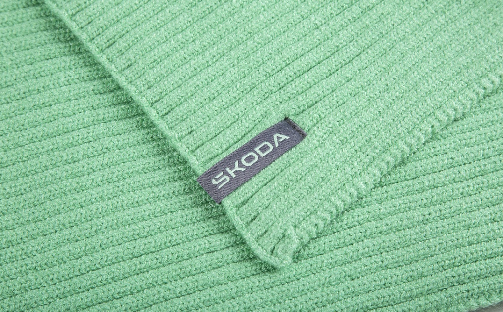 Elektromos zöld kötött sapka és sál készlet. Durva kötött minta. Szürke szövött címke szélén Škoda logóval. A sál hossza 165 x 25 cm.