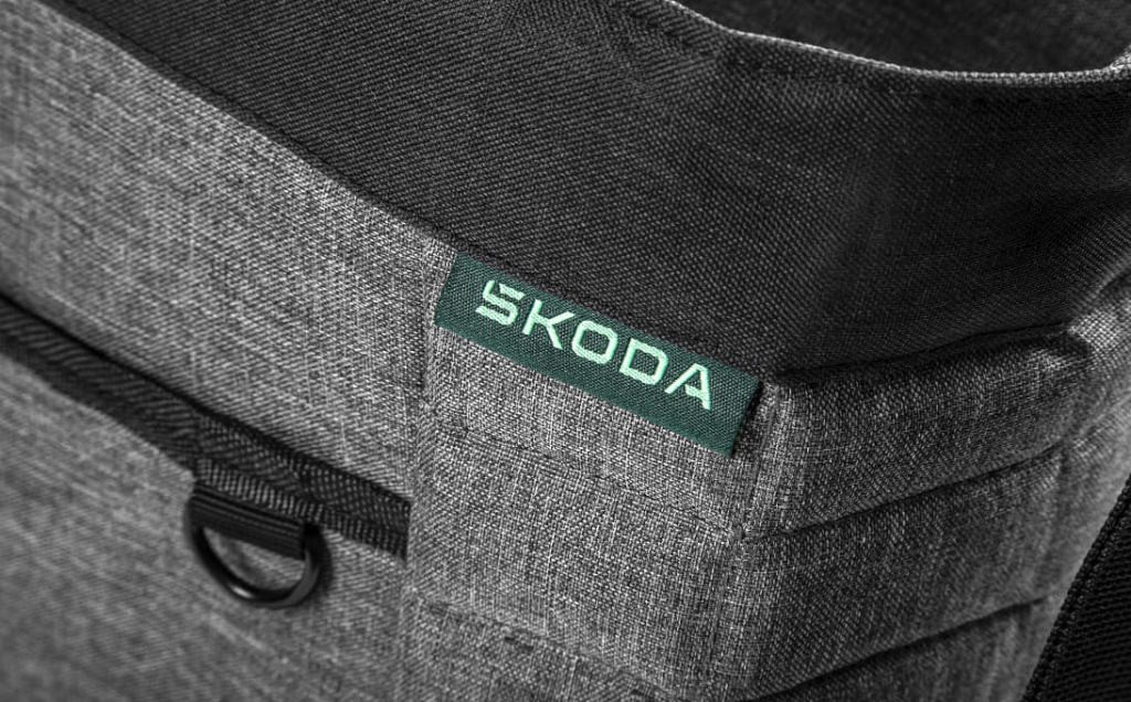 Szürke, újrahasznosított RPET anyagból készült hűtőtáska, smaragdzöld Škoda címkével és elektromos zöld írással, kis zsebbel az elején. Két fülön vagy egy hosszú pánton hordható. Cipzáros rögzítés. Alkalmas hűtött élelmiszerek szállítására.