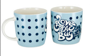 Szép formájú, nagy űrtartalmú kávésbögre vidám VW Bogár mintával. Magassága 9,3 cm. Űrtartalma 370 ml.