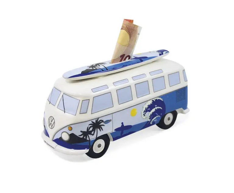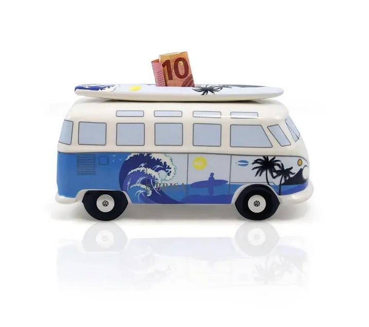 Porcelán VW Bus formájú persely. (Méretarány:1:18) VW T1 mérete szörfdeszka nélkül :24,8 x10,8 x 9,65 cm VW T1 mérete szörfdeszkával: 24,8 x12,0 x 9,65 cm