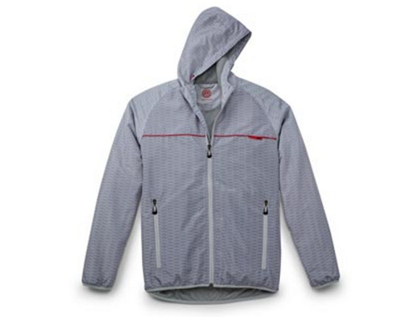 Könnyű, sportos, méhsejtmintás széldzseki kapucnival, cipzáros zsebekkel, hátoldalán nagy fényvisszaverő GTI felirattal. Ez a nagyon könnyű és sportos széldzseki, hölgyeknek és uraknak is megfelelő viselet. A cipzáraknak kerek fém fogantyújuk van GTI dombornyomással. A dzseki színe sötétszürkéből a világosszürkébe megy át.