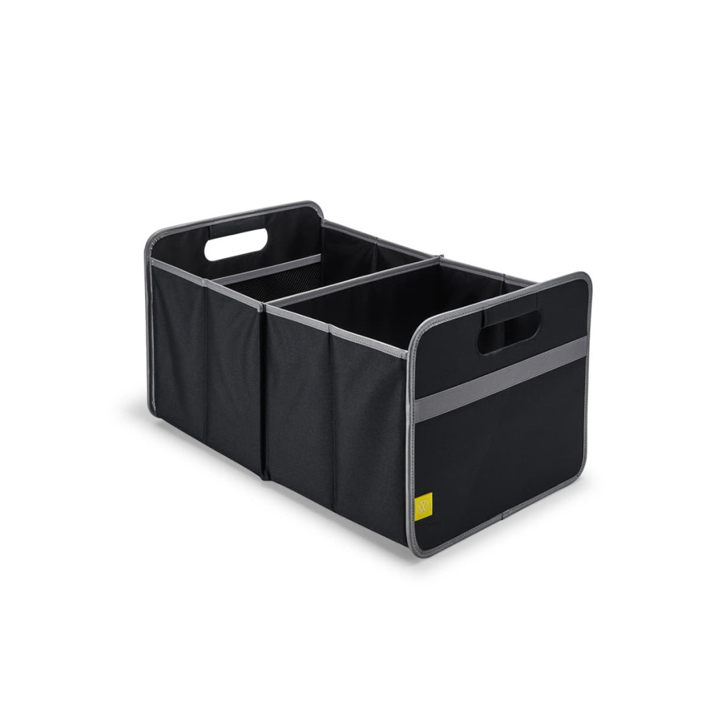 A VW csomagtérrendező box, tartós, víz- és kosztaszító anyagból készült, összehajtható tárolódoboz fényvisszaverő elemekkel, új Volkswagen emblémával.
