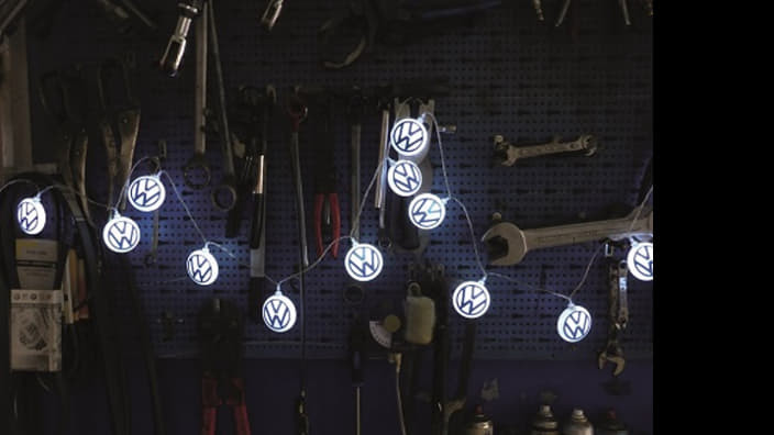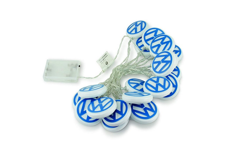 3 méter hosszú fényfüzér, 20 db fehér, műanyagból készült, LED Volkswagen emblémával.