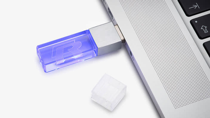 A gyors mobil adattároláshoz: Az elegáns R-Design USB-meghajtó egy üvegtestbe vésett R logóval 8 GB tárhelyet kínál. Működés közben az USB kéken világít.