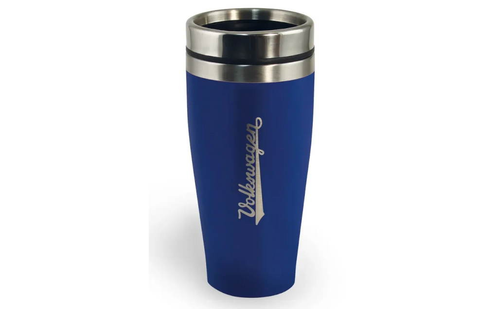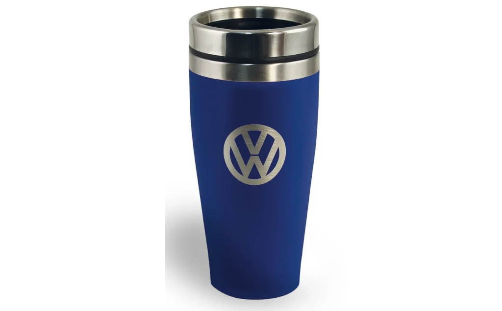Műanyag fedeles, duplafalú thermobögre Volkswagen logóval.